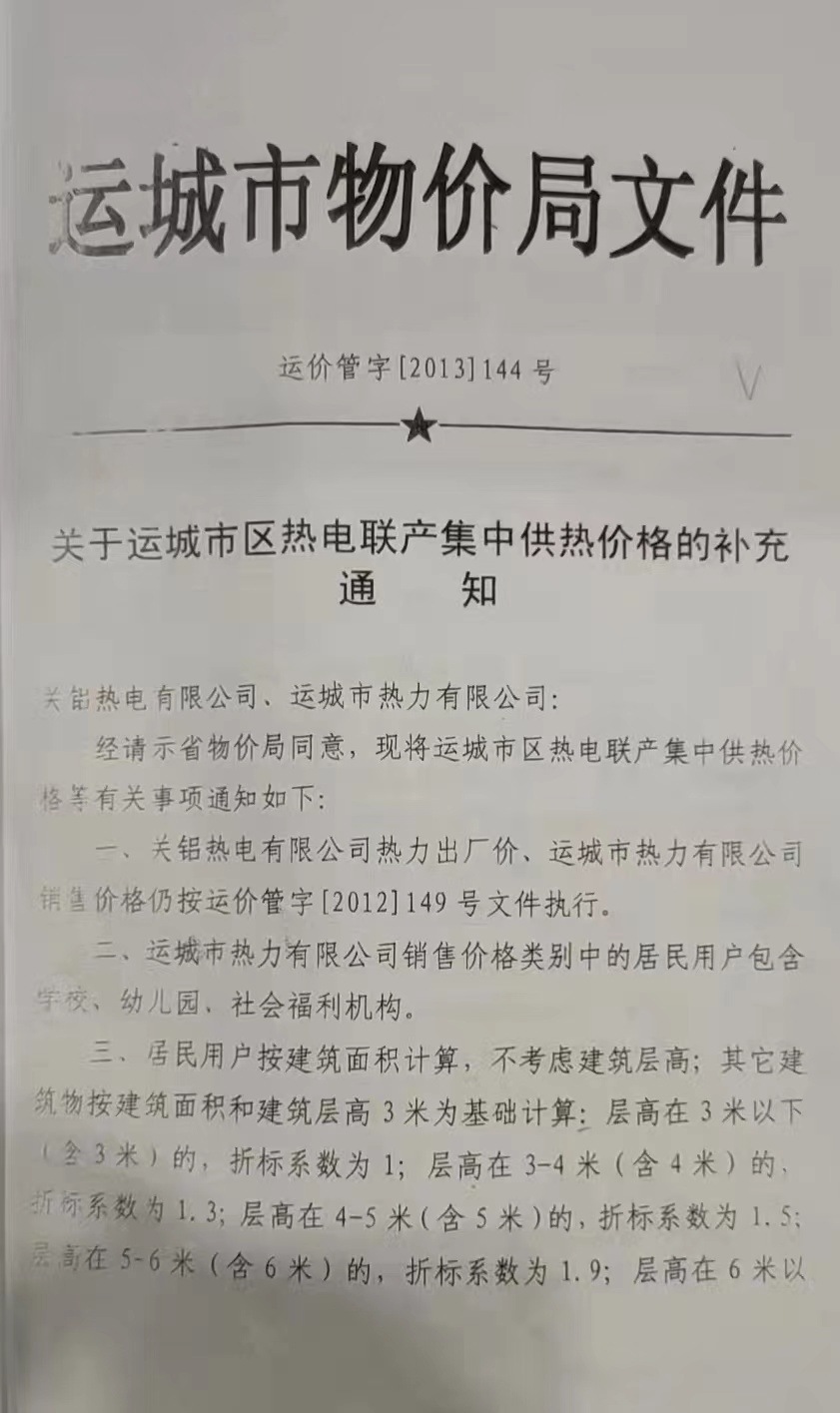 關(guān)于運城市區(qū)熱電聯(lián)產(chǎn)集中供熱價格的補充通知